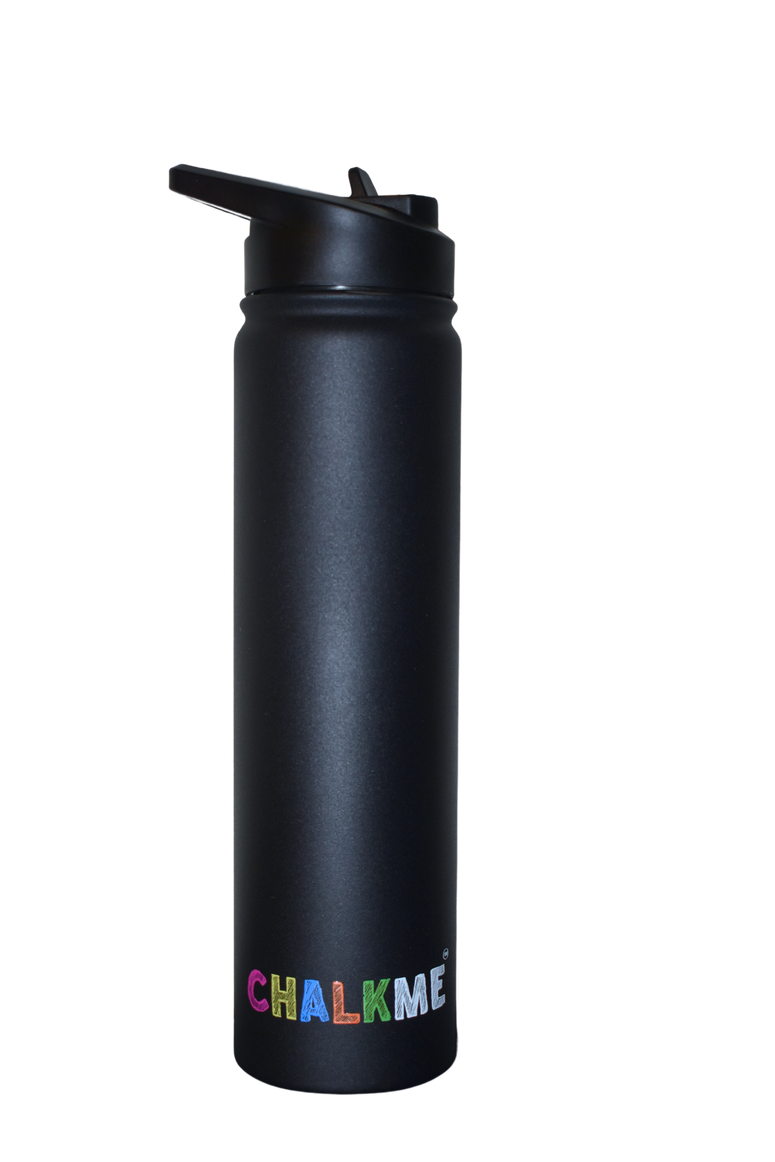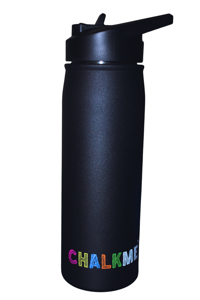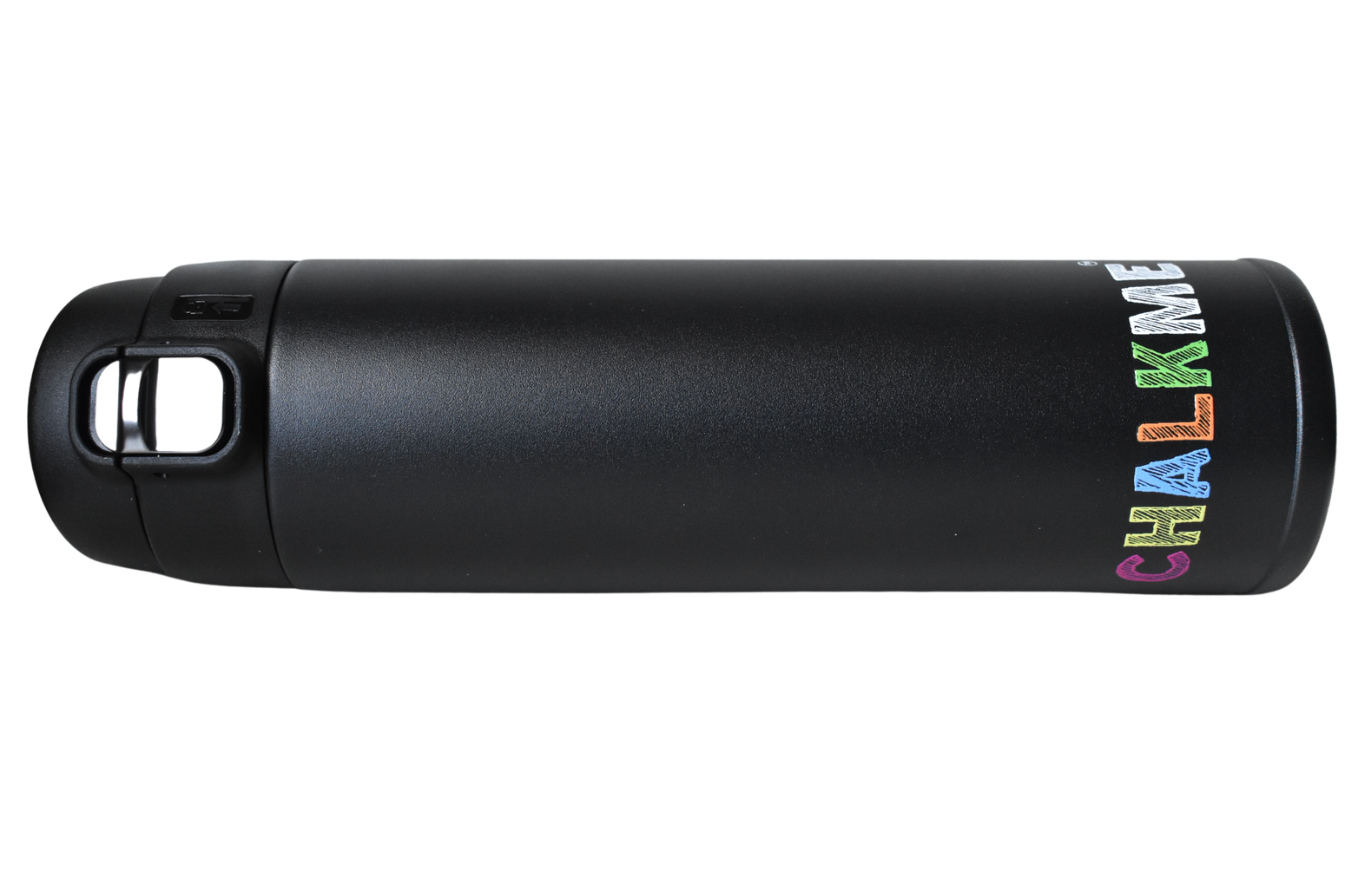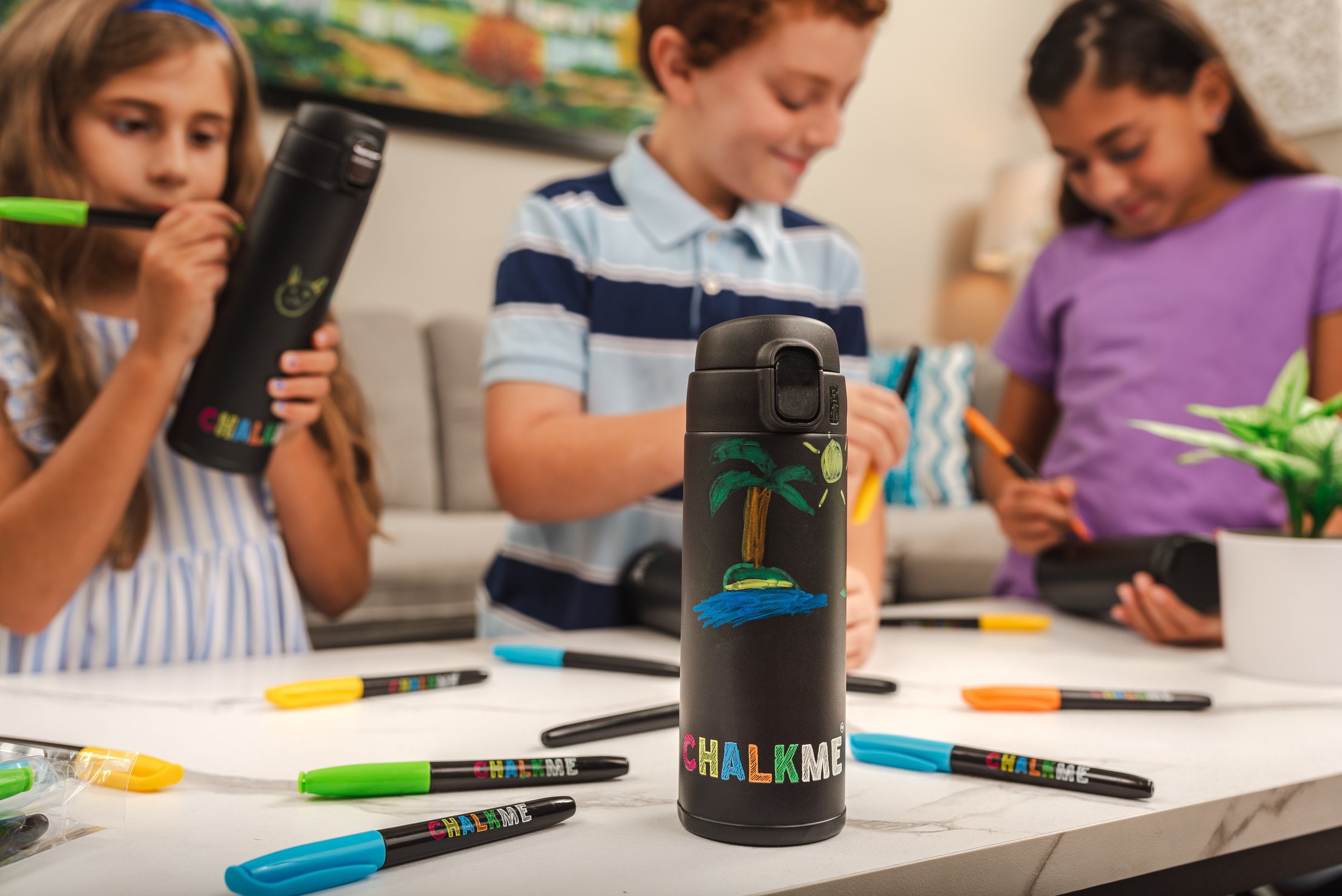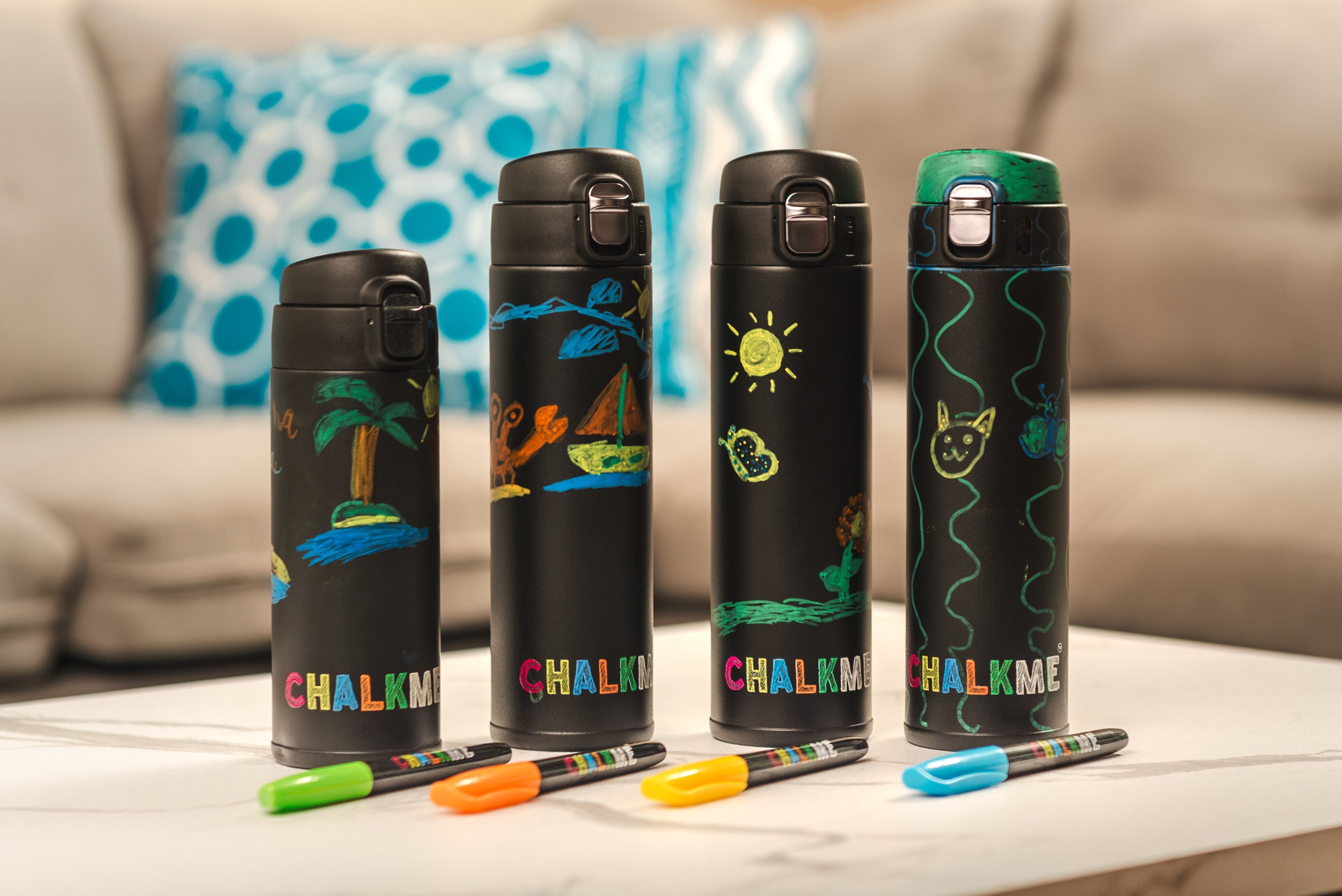 CHALKME is a Stainless steel water bottle designed for kids to expand their creativity by drawing on the bottle's surface with a blackboard experience. With our soft-tip bright chalk marker, the kids can create new designs daily and wipe them when ready to do a new idea. Markers dry for 30 seconds. With CHALKME, kids can unleash their creativity while drinking water